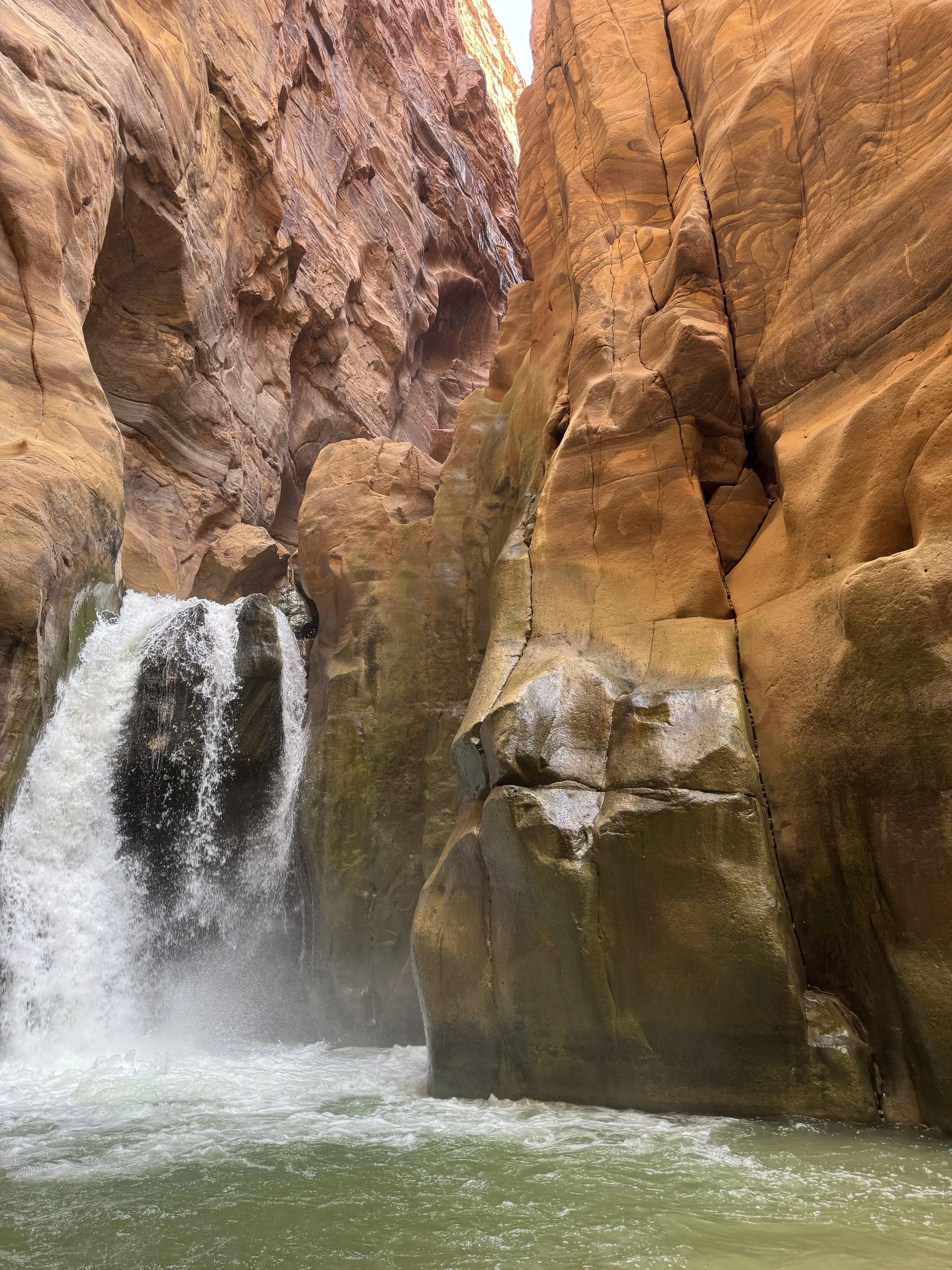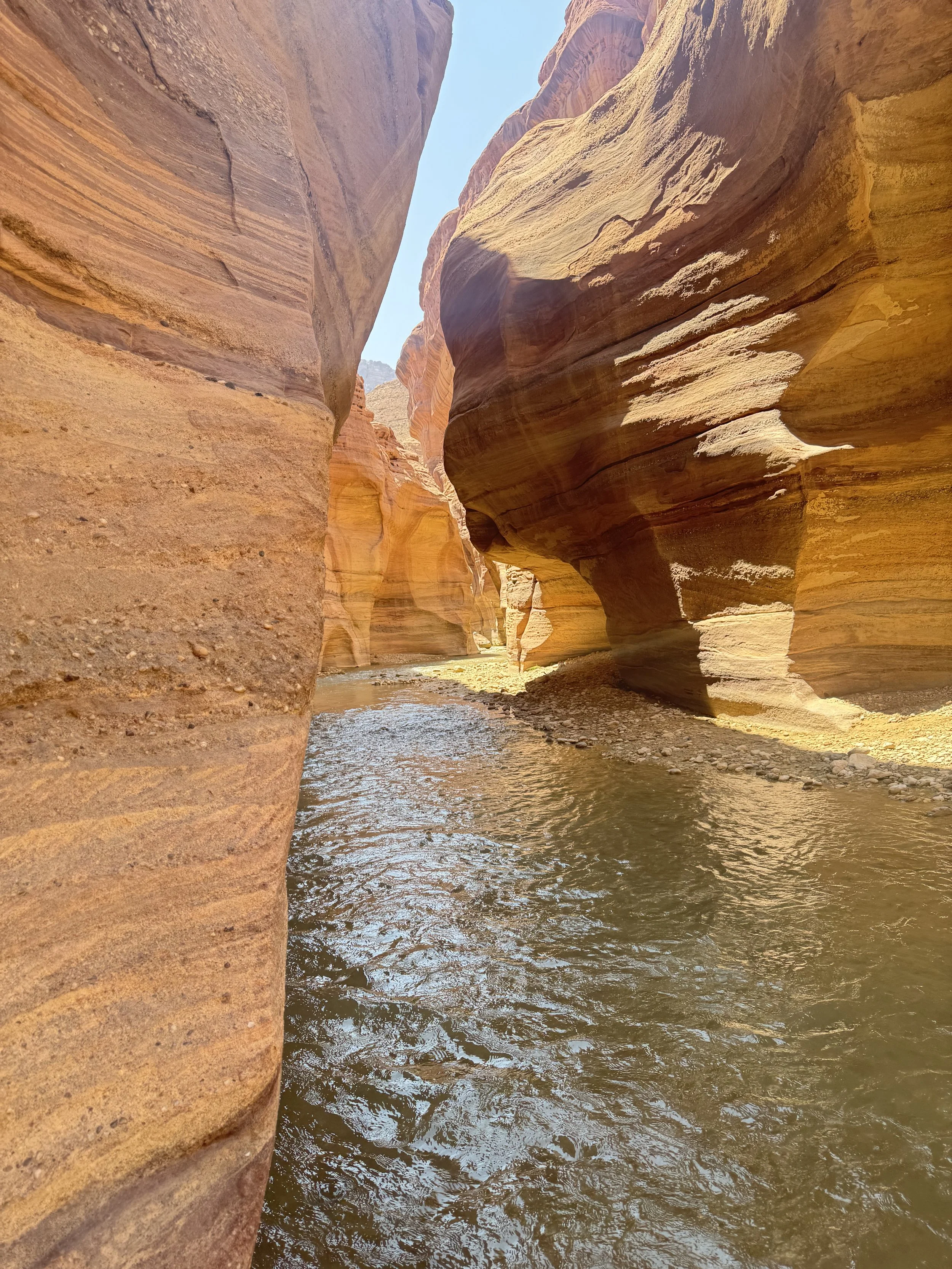 With roughly 80 wadis in Jordan, each with its own unique character, the main challenge is choosing which one to hike. We started with Wadi Mujib, perhaps the best known in Jordan and managed by the Royal Society for the Conservation of Nature (RSCN). This wadi has an entry fee and mandatory lifejackets, which may feel unnecessary for the first kilometer or so of wading through knee-height water, but just wait. Further into the wadi, the river deepens and its strength accelerates against the narrow sandstone walls, which soar up to 1000 meters overhead, blocking out the beating sun and revealing only a thin strip of sky.